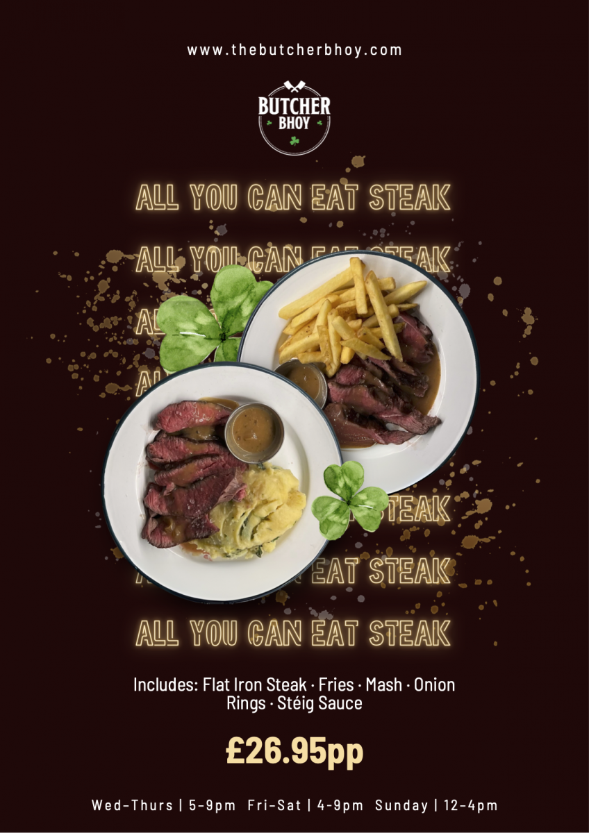 Introducing All You Can Eat Steak at The Butcher Bhoy – where we bring the steak, and you bring the appetite.